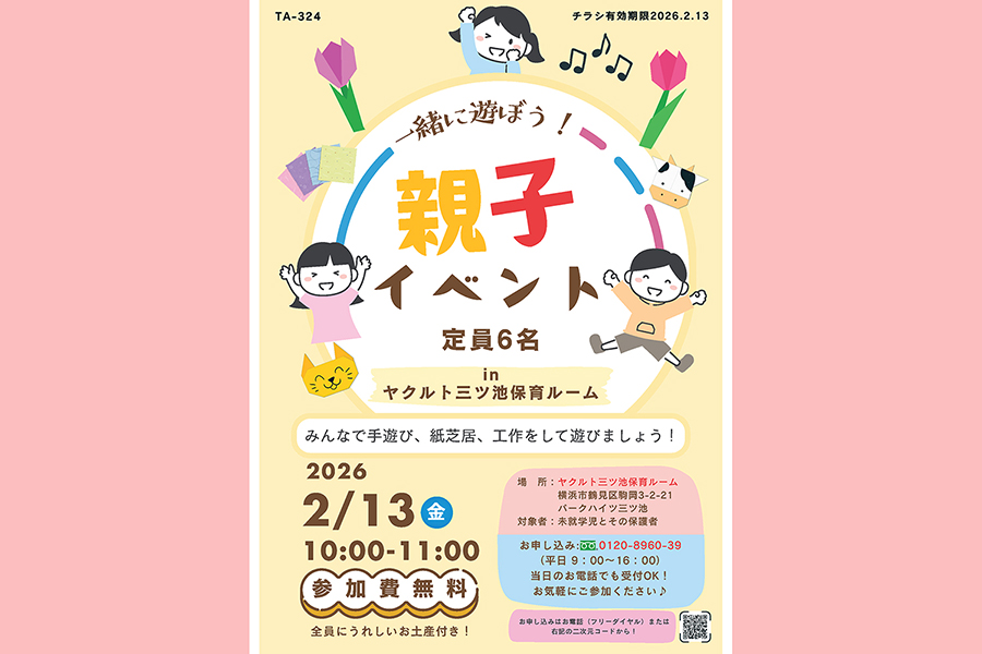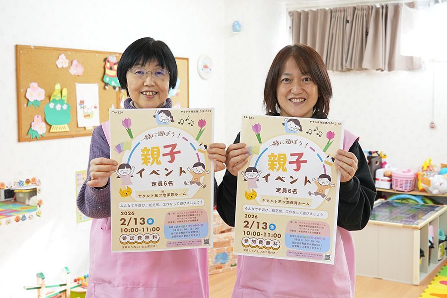 ヤクルト三ツ池センターに併設する「ヤクルト三ツ池保育ルーム」では、2月13日(金)に未就学児とその保護者の方を対象とした「親子イベント」を開催します。